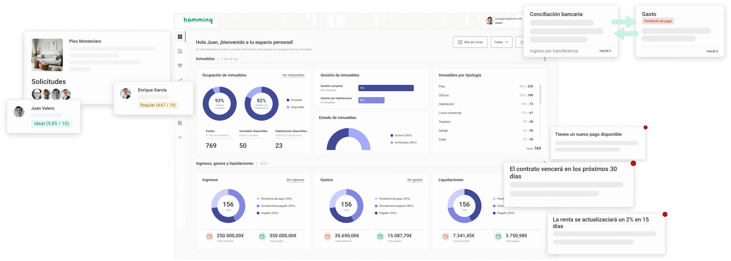 No importa si tienes uno o cientos de inmuebles, o incluso si gestionas por habitaciones, con homming controla todos tus alquileres en un mismo sitio.